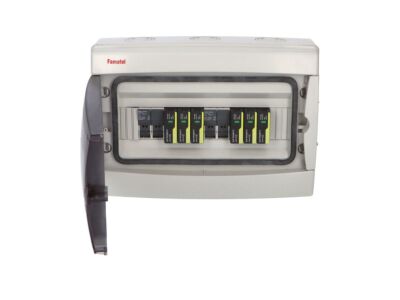 Fotovoltaická rozvodnice FAMATEL SolarBOX fr013 IP65 chránící DC vedení o max. napětí 1000V, pro 2 stringy. Osazena jistícími a ochrannými prvky: 2 x pojistkový odpojovač 1000V DC, 2P 10x38, 2 x svodič přepětí SALTEK 1000V DC typ II, použité pouzdro: 39121 - 215x305x110mm, barva: světle šedá.