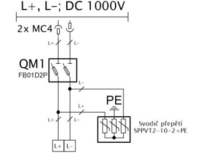 Fotovoltaická rozvodnice (rozváděč nízkého napětí) SolarBOX fr006e IP65 chránící DC vedení o max. napětí 1000V, pro 1 string. Osazena jistícími a ochrannými prvky: 1 x pojistkový odpojovač 1000V DC, 2P 10x38, 1 x svodič přepětí SPPVT2-10-2+PE EATON 1000V DC typ II, 1xkonektor MC4+, 1xkonektor MC4-, 1x kabelová průchodka M20, použité pouzdro: 39081 - celkem k dispozici 8mod. míst, rozměry: 215x235x110mm, plastová, materiál ABS, IK08, zkouška žhavou smyčkou 650°C, bezhalogenová a UV odolná, montáž na povrch, barva: světle šedá, rozsah teplot -25°C + 70°C, aplikované normy: ČSN EN 61439-2 ed. 2, balení: 1ks (fólie), PE svorkovnice součástí (2x16 mm2 + 12x10 mm2) / N svorkovnice součástí (2x16 mm2 + 12x10 mm2), hladké boky (stěny) - pro vyvrtání otvoru a osazení vývodkou (vrchní a spodní strana má stěny s předlisovanými vstupy pro vyvrtání vstupního otvoru a následného osazení příslušnou vývodkou), dodáno s průvodní dokumentací: štítkem rozváděče, návodem pro obsluhu a montáž, krycím listem (charakteristiky rozhraní), protokolem o kusové zkoušce, ES prohlášením o shodě, schématem zapojení a zkouškou oteplení pro rozváděče nízkého napětí. Pro montáž na hořlavé podklady je nutné použít nehořlavou podložku. Recyklační poplatek je zahrnut v ceně výrobku.