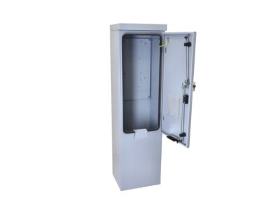 Sloupek energetický 7410 kovový, rozměry: 1265x340x310mm (výška x šířka x hloubka), osazena mont. deska o rozměrech : 500x330x2mm (výška x šířka x hloubka). Předvrtané otvory v montážní desce se závitovými maticemi M6 s roztečemi pro pouzdra AcquaCOMBI 3958, 3959, FlatBOX 5813 a nabíjecí stanice Eleman ORBIS VIARIS UNI. Kovový, materiál práškově lakováná ocel (1,25 mm), odolný, samostatně stojící pro montáž na pevnou zemní desku, spodní kotvící deska s otvory 4xM10 pro ukotvení, barva: šedá RAL 7040, jiné odstíny na vyžádání (MOQ 10 ks). Plné dveře - otevírání pákovou uzamykatelnou klikou, vnější hliníkové panty, hladké boky. Těsnění proti vniknutí nečistot. Připojené kabely lze vyvést při uzavření dveří přes kartáčové těsnění.