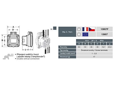 Zásuvka vestavná 13957F IP54/250V/16A s ochranným kolíkem, modrá. Rozměry: 62x50x43mm, rozteč otvorů pro šroubky 38x38mm. Přívod vodičů z horní i spodní části (smyčkovací).