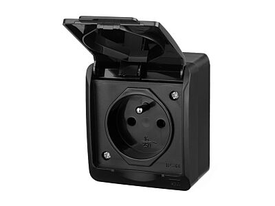 GALATEA 5321-09 IP44 Zásuvka 2P+PE (černá). Rozteč kotvících bodů (výška x šířka): 60x50mm.