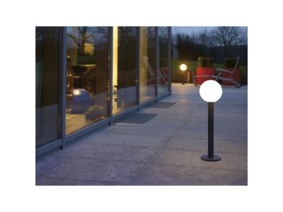 Stojací svítidlo GLOO PURE se skládá z lakované hliníkové trubky, která je zakončena opálovou koulí z pravého skla. Díky patici E27 se mohou používat jak úsporné žárovky, tak i LED. Díky krytí IP44 je vhodná pro venkovní oblast. Řada GLOO PURE obsahuje dále nástěnná a stojací svítidla, a tím je univerzálně použitelná. Volitelně jsou trn do země i spojovací box k bezpečnému elektrickému připojení k dispozici s kruhovým sloupkem svítidla. Elektrické připojení se provádí k síťovému napětí 230 V.