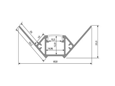Hliníkový profil pro obklady a dlažbu pro LED pásky, rozměry průřezu cca 61x24mm. Součástí je mléčný difuzor, který lze do profilu nacvaknout. Tento profil je určen pro krytí a chlazení LED pásků do šíře až 14mm a výkonu max. 19,2W/m. Profil lze upevnit pomocí vrutů nebo lepidla. K profilu lze zakoupit také koncovky.