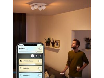 Čtyřbodové svítidlo Philips Buckram v bílém provedení z kolekce inteligentního osvětlení Philips Hue vkusně osvítí Váš obývací pokoj či ložnici. Jeho čtvercatá základna a tělo svítidla jsou vyrobeny z kvalitního kovu s matně bílou povrchovou úpravou. Čtyři kulaté difuzory jsou kryté plastem a osazeny paticí GU10 s maximálním příkonem 4 x 5,5 W. Součástí balení jsou čtyři LED žárovky Hue White Ambiance s příkonem 1 x 5W, svítivostí 350lm a regulovatelnou teplotou chromatičnosti světla od 2200K (teplé žluté světlo) do 6500K (studené bílé světlo) pomocí dálkového ovladače Hue Dimmer Switch (součástí balení), na který lze spárovat až 10 chytrých světel. Žárovka má 4 přednastavená schémata svícení, dvě v bílé barvě světla Povzbuzující a Soustředění, dvě ve žluté barvě světla Čtení a Relaxační. Výhodou je možnost ovládat svítidlo přes Bluetooth aplikaci ve Vašem mobilním zařízení či tabletu. Krytí IP20 je určeno pro vnitřní použití. Rozměry svítidla jsou 10,3 x 24 x 24 cm.