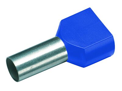 Izolované koncovky dvojitého drátu. Technické údaje, materiál: Cu-ETP podle DIN EN 13600, povrch: elektrolyticky pocínovaný. Polypropylenová izolace. Teplotní odolnost -35 °C až +105 °C. Pro bezproblémové zpracování 2 jemně laněných měděných vodičů, zabraňuje poškození a splétání. Barevná řada 1. provedení: průřez: 2x0,75 mm², délka bez izolace L2: 8 mm; celková délka L1: 15 mm; D1: 1,8, S1: 0,15; S2: 0,25; D2: 2,8; barva izolace: modrá; hmotnost na 100 ks:~kg: 0,03; PU/ks: 100.