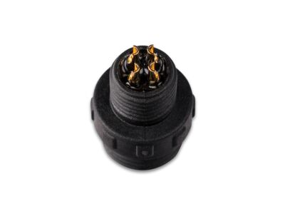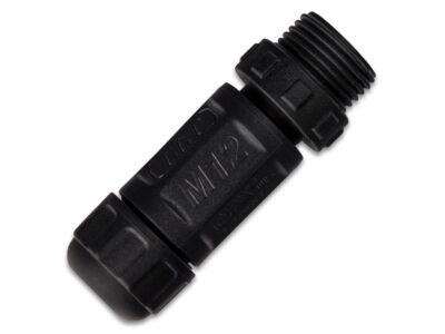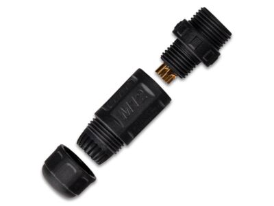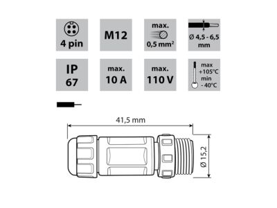 Vidlice bez převlečné matice, IP67, pájecí, pozlacené kontakty, M12, 4piny - například pro RGB LED pásky. Průřez připájitelného kabelu max. 0,5mm², průměr kabelu 4,5-6,5mm, max. 10A/110V. Rozměry: 41,5x15,2mm.