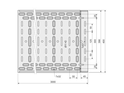 Kabelový žlab s integrovanou spojkou KZI 110x400 z plechu tloušťky 1,0 mm v povrchové úpravě Magnelis®, děrovaný, opatřený embosy pro zvýšení pevnosti a tuhosti.