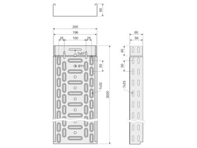 Kabelový žlab KZ 60x200 z plechu tloušťky 1,25 mm pro spojení pomocí integrované spojky, v povrchové úpravě sendzimir, děrovaný, opatřený embosy pro zvýšení pevnosti a tuhosti, certifikovaný pro systémy se zachováním funkčnosti při požáru