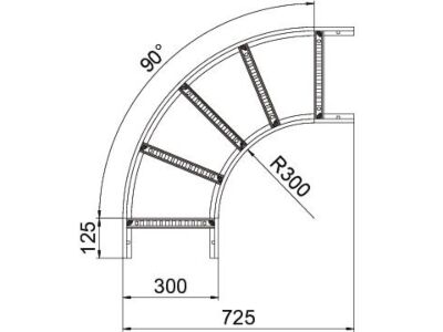 Oblouk 90°, horizontální, s přivařenou příčkou, pro všechny typy kabelových žebříků s výškou bočnice 60 mm.