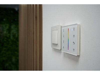 Ovladač s vysokofrekvenční technologií. Vlastnosti výrobku: Nástěnný dotykový panel k rádiovému ovládání modulů RGBW LED. Výstupní signál: 2,4 GHz. Vstupní napětí: 100…240 V. Výhody výrobku: Velmi citlivý dotykový panel z vysoce pevného skla s podsvícením a s dotykovým posuvným ovladačem barvy uprostřed. Stmívání nastavených barev světla RGB a bílé. 10 předinstalovaných barevných přechodů. Ovládání až 4 zón. Samostatné ovládání červené, zelené, modré a bílé barvy. Snadná výměna za standardní vypínač světla. Oblasti použití: Všeobecné osvětlení. Architektonické osvětlení. Dynamické světlo jako architektonický prvek ve veřejných prostorách. Nepřímé osvětlení. Hotely. Kanceláře. Obytné interiéry.