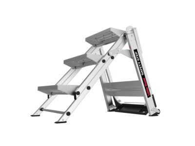 Bezpečné a pohodlné skládací schůdky s širokými patkami pro náročné používání se sklápěcím madlem a kolečky pro snazší přesun.