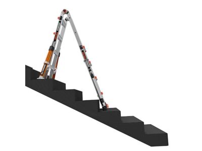- Schodišťový žebřík: Samostatně stojícímu žebříku v konfiguraci A (štafle) lze libovolně upravit délku jedné strany tak, aby se dal bezpečně umístit na schodiště.