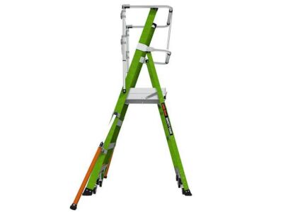 Skládací pojízdný plošinový žebřík z nevodivého kompozitu fiberglass s pevnou plně uzavřenou klecí. Plošina je osazena kolečky pro snadnou přepravu.