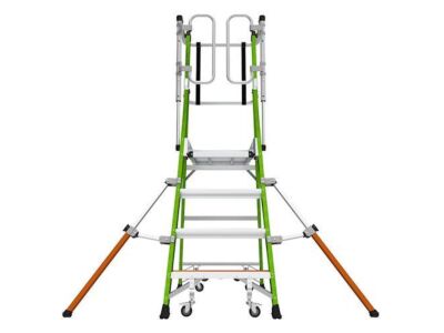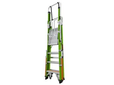 Skládací pojízdný plošinový žebřík z nevodivého kompozitu fiberglass s pevnou plně uzavřenou klecí. Plošina je osazena kolečky pro snadnou přepravu.