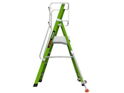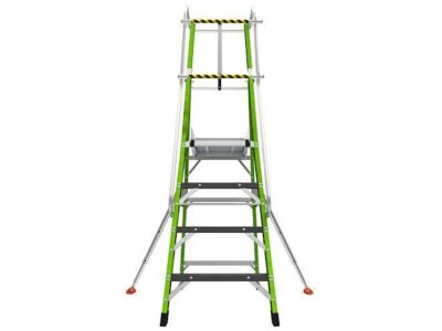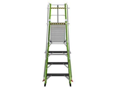 Skládací plošinový žebřík z nevodivého kompozitu fiberglass s pevnou plně uzavřenou klecí a podpěrnými nohami. Plošina je osazena kolečky pro snadnou přepravu.