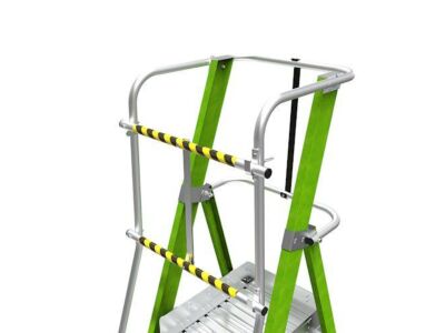 Skládací plošinový žebřík z nevodivého kompozitu fiberglass s pevnou plně uzavřenou klecí a podpěrnými nohami. Plošina je osazena kolečky pro snadnou přepravu.