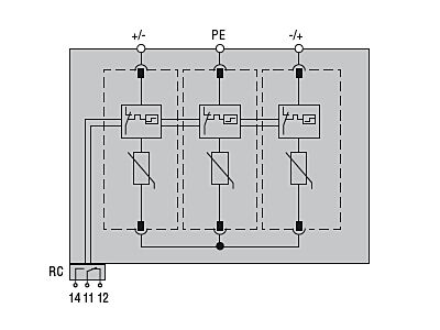 Přepěťová ochrana typu 1,2 pro fotovoltaické aplikace se zásuvnou patronou, zkratový proud Iscpv 11kA, +, -, PE. Se vzdáleným kontaktem