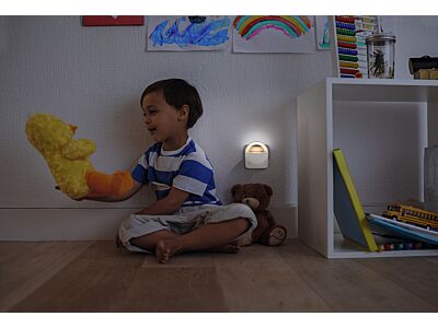 Zásuvkové noční svítidlo s TOUCH Dim. Vlastnosti výrobku: Integrovaný senzor pro den/noc. Volitelná intenzita světla pomocí dotykového spínače. Výhody výrobku: Plug and play díky EU zástrčce. Funkční a atraktivní design. Spínání a třístupňové stmívání prostřednictvím dotykového senzoru na podstavci svítidla. Příjemné, teplé bílé světlo. Oblasti použití: Dětské pokoje. Pouze pro použití v interiérech. Funkce nočního světla. Bezpečnostní informace: Tento výrobek není hračka. Děti bez dozoru ho nesmí používat ani s ním manipulovat.. Není určeno jako náhrada běžného osvětlení v domácnosti..