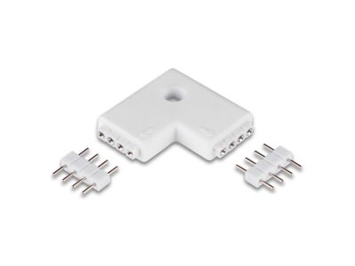 Propojovací konektor tvar L pro RGB LED pásky šíře 10mm. Konektor obsahuje dva výjimatelné propojovací díly, každý z nich je třeba připájet k RGB LED pásku. Následně lze tyto části vsunout do konektoru, tím dojde k propojení.