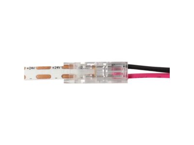 Připojovací konektor jednobarevných COB LED pásků šíře 5 mm, 2 piny, délka 150 mm, 20AWG, vodiče černý/červený, max. 5,5 A, Rozměry konektoru cca: šíře 7,8 x délka 19,5 x výška 6,4 mm. Transparentní plast. Slouží k připojení COB LED pásků k řízení bez nutnosti pájení. Po nacvaknutí lze použít opakovaně. Konektor nasaďte tak, aby piny dosedly na pájecí plošky LED pásku!