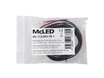 Připojovací konektor jednobarevných COB LED pásků šíře 5 mm, 2 piny, délka 2000 mm, 20AWG, vodiče černý/červený, max. 5,5 A, Rozměry konektoru cca: šíře 7,8 x délka 19,5 x výška 6,4 mm. Transparentní plast. Slouží k připojení COB LED pásků k řízení bez nutnosti pájení. Po nacvaknutí lze použít opakovaně. Konektor nasaďte tak, aby piny dosedly na pájecí plošky LED pásku!
