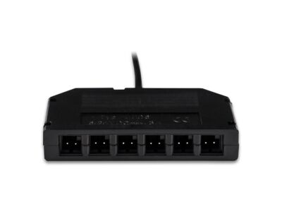 Rozbočovač MP s 6 výstupy, max. 3A/výstup, celkem max. 8A, 0,5m kabel AWG20/0,5mm² s power konektorem. Rozměry rozbočovače cca: 58,2x10x38 mm, průměr power konektoru cca 10,5 mm. Černá barva.