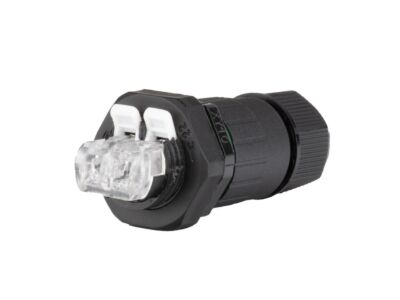 Kabelová přívodka rovná, 2 póly, bezšroubové svorky + a -, IP68. Rozměry přívodky: délka 56,3mm x průměr 25mm, otvor průměr 21mm, max.16A/250V, pro průměry kabelu 4-7mm, max. průřez 2,5mm².