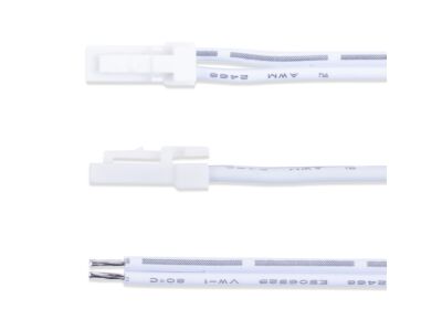 Připojovací kabel s 91505-MP konektorem (vidlice), 1m kabel AWG20/0,5mm², UL2468, volný konec 5mm, 12-24V max. 3A. Rozměry konektoru cca: 6,4 x 5,5 x 15,4 mm. Bílá barva.