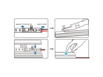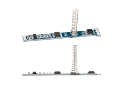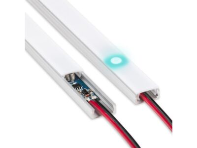 Dotykový stmívač LED pásku do hliníkových profilů, 6mm, s pružinou, bez paměťové funkce, max. 4A. Rozměry: 55x6x20mm. PCB lze zastříhnout z šíře 10mm až na 6mm. Pružinu lze zkrátit z 20 mm až na 5mm dle použitého AL profilu. Senzor si nepamatuje poslední nastavenou hodnotu jasu v případě výpadku napájení.