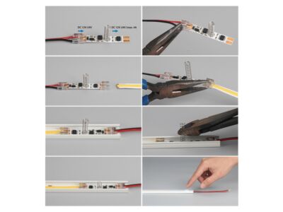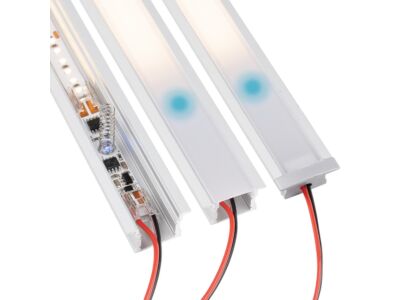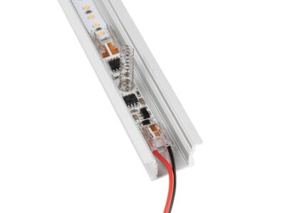 Dotykový stmívač LED pásku do hliníkových profilů, s konektory, pružinou a bez paměťové funkce, max. 3A. Pružinu lze zkrátit z 20 mm až na 5 mm. Rozměry (bez konektorů): šíře 8 mm, délka 50 mm. Konektory: šířka 11,5 mm, výška 4,2 mm, pro kabel max. AWG20. Prořezávací konektory stačí nacvaknout kleštěmi. Senzor si nepamatuje poslední nastavenou hodnotu jasu při výpadku.