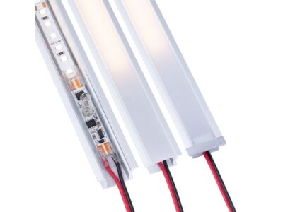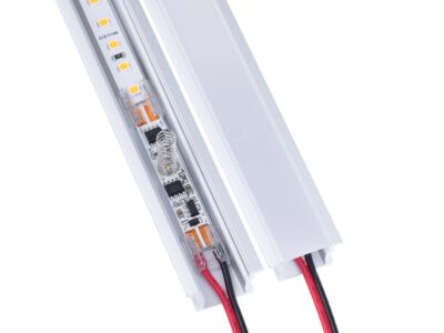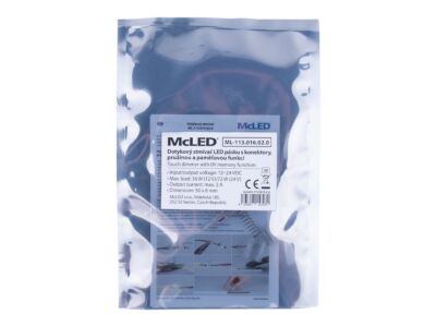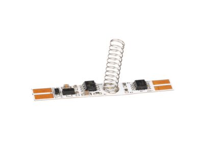 Dotykový stmívač LED pásku do hliníkových profilů, s konektory, pružinou a s paměťovou funkcí, max. 2A. Pružinu lze zkrátit z 20 mm až na 5 mm. Rozměry (bez konektorů): šíře 8 mm, délka 50 mm. Konektory: šířka 10 mm, výška 4,2 mm. Pro pásky šíře 8mm, pro kabel max. AWG20. Prořezávací konektory stačí nacvaknout kleštěmi. Senzor si pamatuje poslední nastavenou hodnotu jasu při výpadku. Teple bílý LED indikátor.