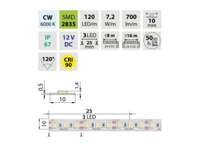 LED pásek SMD2835, studená bílá (6000K), 7,2W, 120LED, 700lm/m, CRI>90, segment 25mm, 3LED/segment, IP67, DC 12V, životnost 50000h, šíře 10mm, bílý PCB pásek, max. délka pásku při jednostranném zapojení: 5m, opatřen samolepící páskou 3M, UV stabilní. Balení 50m.