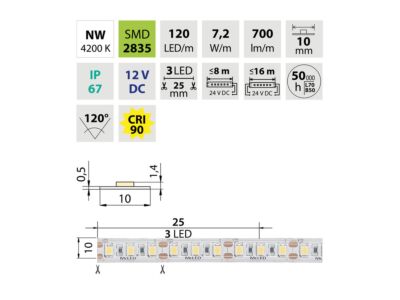 LED pásek SMD2835, neutrální bílá (4200K), 7,2W, 120LED, 700lm/m, CRI>90, segment 25mm, 3LED/segment, IP67, DC 12V, životnost 50000h, šíře 10mm, bílý PCB pásek, max. délka pásku při jednostranném zapojení: 5m, opatřen samolepící páskou 3M, UV stabilní. Balení 5m.