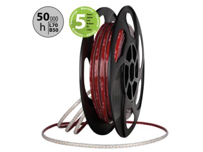 LED pásek SMD2835, teplá bílá (3000K), 7,2W, 120LED, 670lm/m, CRI>90, segment 25mm, 3LED/segment, IP67, DC 12V, životnost 50000h, šíře 10mm, bílý PCB pásek, max. délka pásku při jednostranném zapojení: 5m, opatřen samolepící páskou 3M, UV stabilní. Balení 50m.