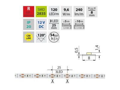 LED pásek SMD2835, červený R, 9,6W, 120LED, 240lm/m, CRI>90, segment 25mm, 3LED/segment, IP20, DC 12V, životnost 54000h, šíře 8mm, bílý PCB pásek, max. délka pásku při jednostranném zapojení: 5m, opatřen samolepící páskou 3M, UV stabilní. Balení 50m.