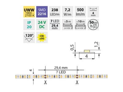 LED pásek SMD2216, ultra teplá bílá (2000K), 7,2W, 238LED, 500lm/m, CRI90, segment 29,4mm, 7LED/segment, IP20, DC 24V, životnost 50000h, šíře 4mm, bílý PCB pásek, max. délka pásku při jednostranném zapojení: 5m, opatřen samolepící páskou 3M, UV stabilní. Balení 10m.
