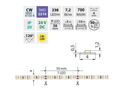 LED pásek SMD2216, studená bílá (6000K), 7,2W, 238LED, 700lm/m, CRI90, segment 29,4mm, 7LED/segment, IP20, DC 24V, životnost 50000h, šíře 4mm, bílý PCB pásek, max. délka pásku při jednostranném zapojení: 5m, opatřen samolepící páskou 3M, UV stabilní. Balení 10m.