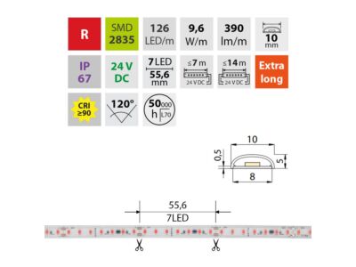 LED pásek do sauny SMD2835, červená (625nm), 9,6W, 120LED, 390lm/m, segment 55,556mm, 7LED/segment, IP67, DC 24V, životnost 50000h, šíře 10mm, bílý PCB pásek, max. délka pásku při jednostranném zapojení: 7m, opatřen samolepící páskou 3M, UV stabilní, pro teploty max. 105 °C. Balení 50m.