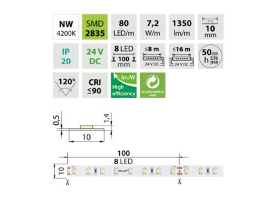 LED pásek SMD2835, neutrální bílá (4200K), 7,2W, 80LED, 1350lm/m, CRI>90, segment 100mm, 8LED/segment, IP20, DC 24V, životnost 50000h, šíře 10mm, bílý PCB pásek, max. délka pásku při jednostranném zapojení: 8m, opatřen samolepící páskou 3M, UV stabilní. Délka 50m.