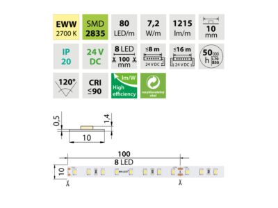 Stmívatelný LED pásek SMD2835, extra teplá bílá (2700K), 7,2W, 80LED, 1215lm/m, CRI>90, segment 100mm, 8LED/segment, IP20, DC 24V, životnost 50000h, šíře 10mm, bílý PCB pásek, max. délka pásku při jednostranném zapojení: 8m, opatřen samolepící páskou 3M, UV stabilní. Délka 50m.