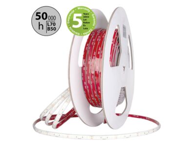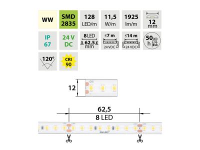 LED pásek SMD2835, teplá bílá (3000K), 11,5W, 128LED, 1925lm/m, CRI>90, segment 62,5mm, 8LED/segment, IP67, DC 24V, životnost 50000h, šíře 12mm, bílý PCB pásek, max. délka pásku při jednostranném zapojení: 7m, opatřen samolepící páskou 3M, UV stabilní. Délka 50m.
