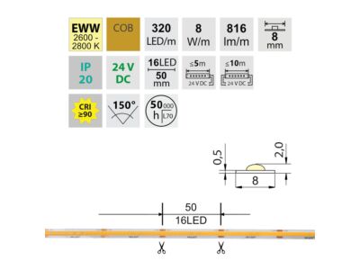Stmívatelný LED pásek COB, extra teplá bílá (2700K), 8W, 320LED, 816lm/m, CRI>90, segment 50mm, 16LED/segment, IP20, DC 24V, životnost 50000h, šíře 8mm, bílý PCB pásek, max. délka pásku při jednostranném zapojení: 5m, opatřen samolepící páskou 3M, UV stabilní. Balení 50m