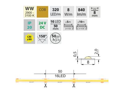 LED pásek COB WW, 320LED/m, 8W/m, DC 24V, 840lm/m, CRI90, IP20, modul 50mm, 8mm, 50m