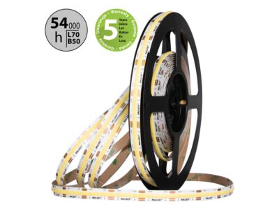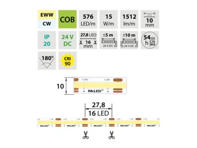 Stmívatelný LED pásek COB, dual white EWW-CW (2700K+6000K), 15W, 576LED, 1512lm/m, CRI>90, segment 27,8mm, 16LED/segment, IP20, DC 24V, životnost 54000h, šíře 10mm, bílý PCB pásek, max. délka pásku při jednostranném zapojení: 5m, opatřen samolepící páskou 3M, UV stabilní, balení 50m.