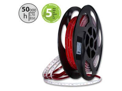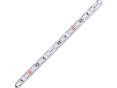 LED pásek SMD5050, RGB - barevný, 12W, 60LED, 320lm/m, segment 100mm, 6LED/segment, IP67, DC 24V, životnost 50000h, šíře 12mm, bílý PCB pásek, max. délka pásku při jednostranném zapojení: 5m, opatřen samolepící páskou 3M.