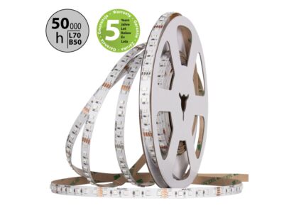 LED pásek SMD2835, RGB - barevný, 14,4W, 120LED, 450lm/m, segment 50mm, 6LED/segment, IP20, DC 24V, životnost 50000h, šíře 8mm, bílý PCB pásek, max. délka pásku při jednostranném zapojení: 5m, opatřen samolepící páskou 3M. Délka 5m.
