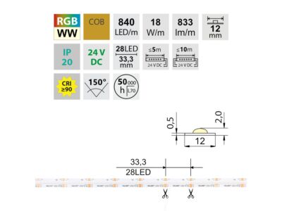 LED pásek COB, RGB + teplá bílá (3000K), 18W, 840LED, 833lm/m, CRI>90, segment 33,3mm, 28LED/segment, IP20, DC 24V, životnost 50000h, šíře 12mm, bílý PCB pásek, max. délka pásku při jednostranném zapojení: 5m, opatřen samolepící páskou 3M, UV stabilní. Balení 50m.