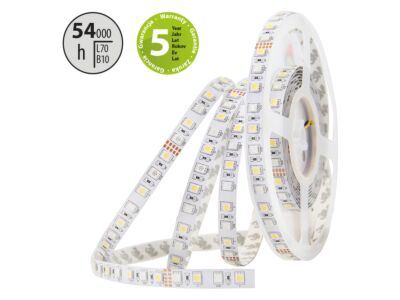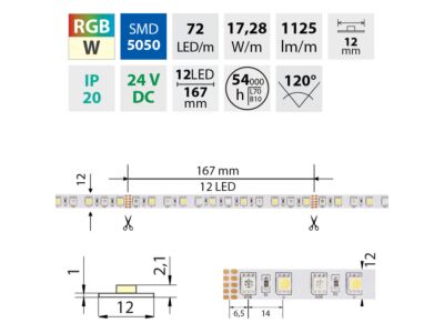 LED pásek SMD5050, RGB + studená bílá CW (6000K), 17,2W, 72LED, 1125lm/m (R:94, G:248, B:53, CW:726lm), CRI80, segment 167mm, 12LED/segment, IP20, DC 24V, životnost 54000h, šíře 12mm, bílý PCB pásek, max. délka pásku při jednostranném zapojení: 4m, opatřen samolepící páskou 3M. Balení 50m.