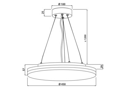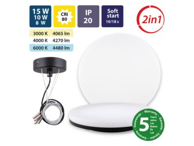 LED závěsné svítidlo 36W černé, 230V, IP20, 3CCT - teplá, neutrální nebo studená bílá, max. světelný tok 4065lm/3000K, 4270lm/4000K, 4480lm/6000K, svíticí přímo/nepřímo (95/5%), vyzařovací úhel 150°, CRI 80, životnost 50.000h, rozměry ø450x70mm + závěs 1,2m včetně černého dvoužilového přívodu, materiál plast/kov, mléčný difuzor, nestmívatelné, PF>0,9, s přepínači výkonu 36/32/28W, teploty chromatičnosti 3000/4000/6000K a doby náběhu ≤1/10/18s