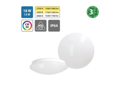 LED stropní a nástěnné svítidlo 18W bílé, 230V, IP64, 3CCT - teplá nebo neutrální bílá, max. světelný tok 1500lm/2700K, 1750lm/3000K, 1630lm/4000K, vyzařovací úhel 120°, CRI 90, životnost 100.000h, rozměry ø280x80mm, materiál plech/plast, mléčný difuzor, nestmívatelné, PF>0,9, s přepínači výkonu 18/13W a teploty chromatičnosti 2700/3000/4000K